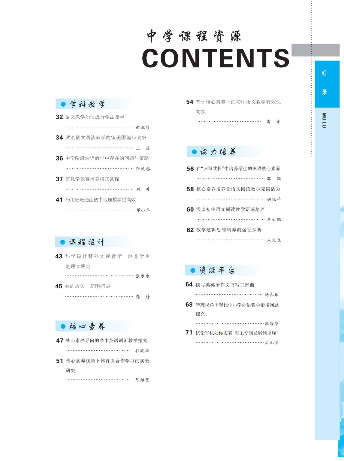 《中学课程资源》由大连理工大学出版社主办,是国家新闻出版署认定的首批学术期刊。中国知网(CNKI)、万方数据库、维普资讯网全文收录期刊。本刊栏目设计精当,内容丰富,能够在思想上、政策上、业务上满足教育工作者、学生、家长的阅读需求:为助推中学课程改革、提高教师素质提供优质服务;为各学科教师分享教学经验以及交流教育成果提供广阔的资源平台;为有不同需求的学生提供学习助力,拓展视野,开阔思路;为家长在新课程实施过程中转变教育观念,与学校共同教育培养学生提供及时、可靠的信息。