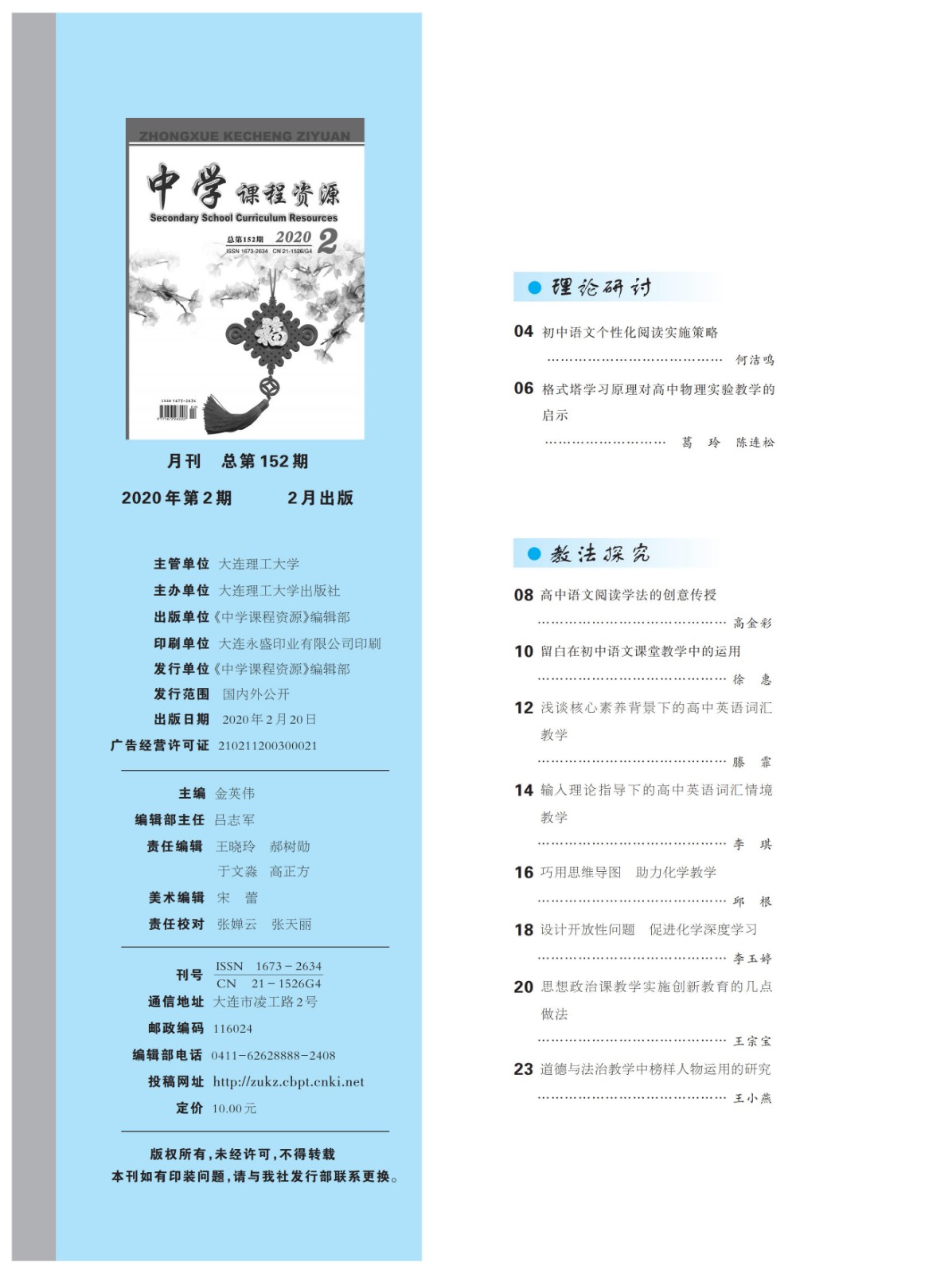 《中学课程资源》由大连理工大学出版社主办,是国家新闻出版署认定的首批学术期刊。中国知网(CNKI)、万方数据库、维普资讯网全文收录期刊。本刊栏目设计精当,内容丰富,能够在思想上、政策上、业务上满足教育工作者、学生、家长的阅读需求:为助推中学课程改革、提高教师素质提供优质服务;为各学科教师分享教学经验以及交流教育成果提供广阔的资源平台;为有不同需求的学生提供学习助力,拓展视野,开阔思路;为家长在新课程实施过程中转变教育观念,与学校共同教育培养学生提供及时、可靠的信息。