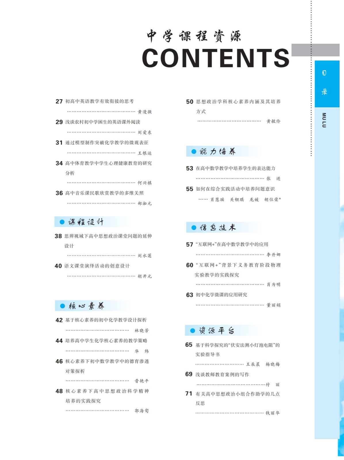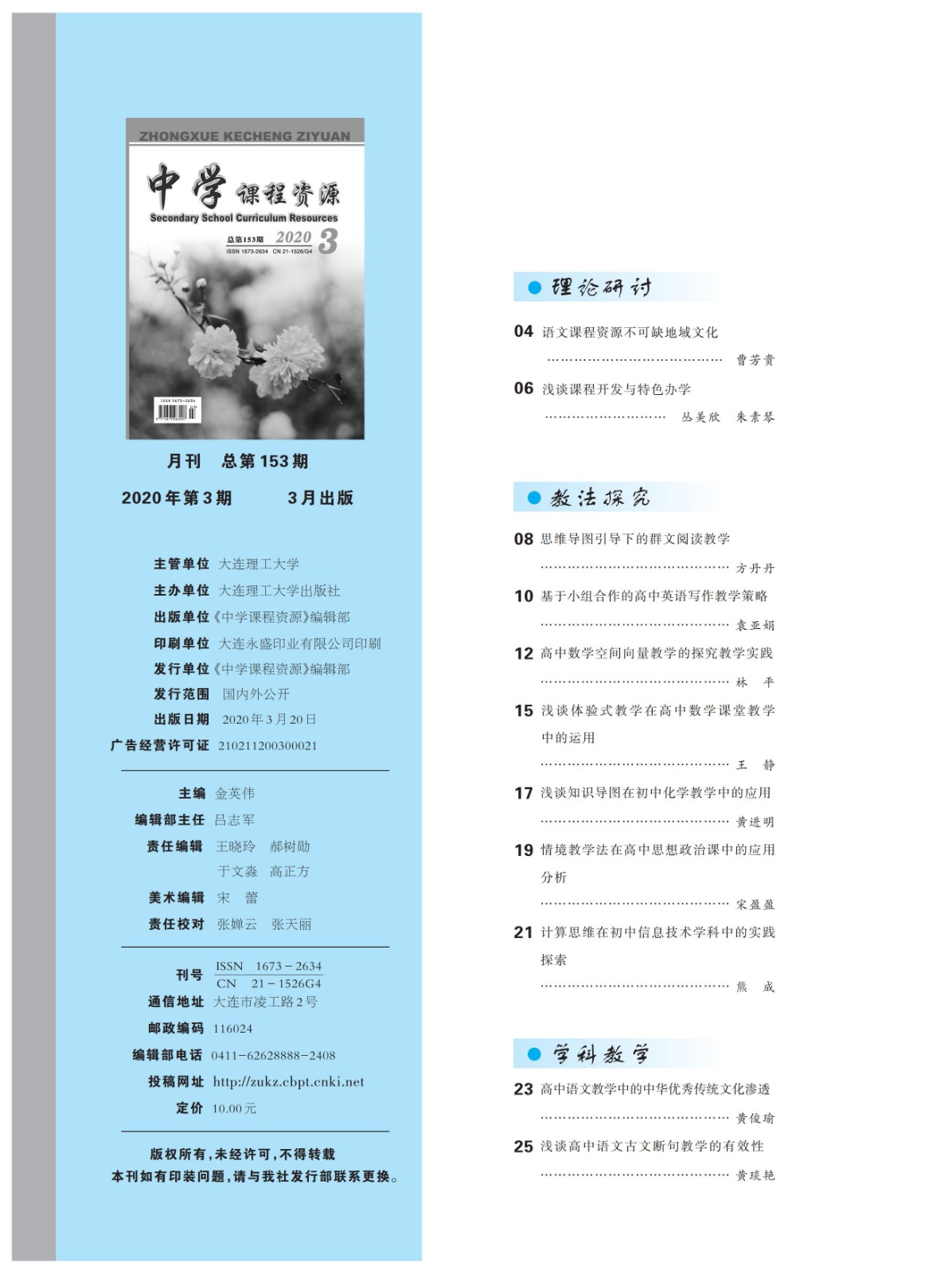 《中学课程资源》由大连理工大学出版社主办,是国家新闻出版署认定的首批学术期刊。中国知网(CNKI)、万方数据库、维普资讯网全文收录期刊。本刊栏目设计精当,内容丰富,能够在思想上、政策上、业务上满足教育工作者、学生、家长的阅读需求:为助推中学课程改革、提高教师素质提供优质服务;为各学科教师分享教学经验以及交流教育成果提供广阔的资源平台;为有不同需求的学生提供学习助力,拓展视野,开阔思路;为家长在新课程实施过程中转变教育观念,与学校共同教育培养学生提供及时、可靠的信息。
