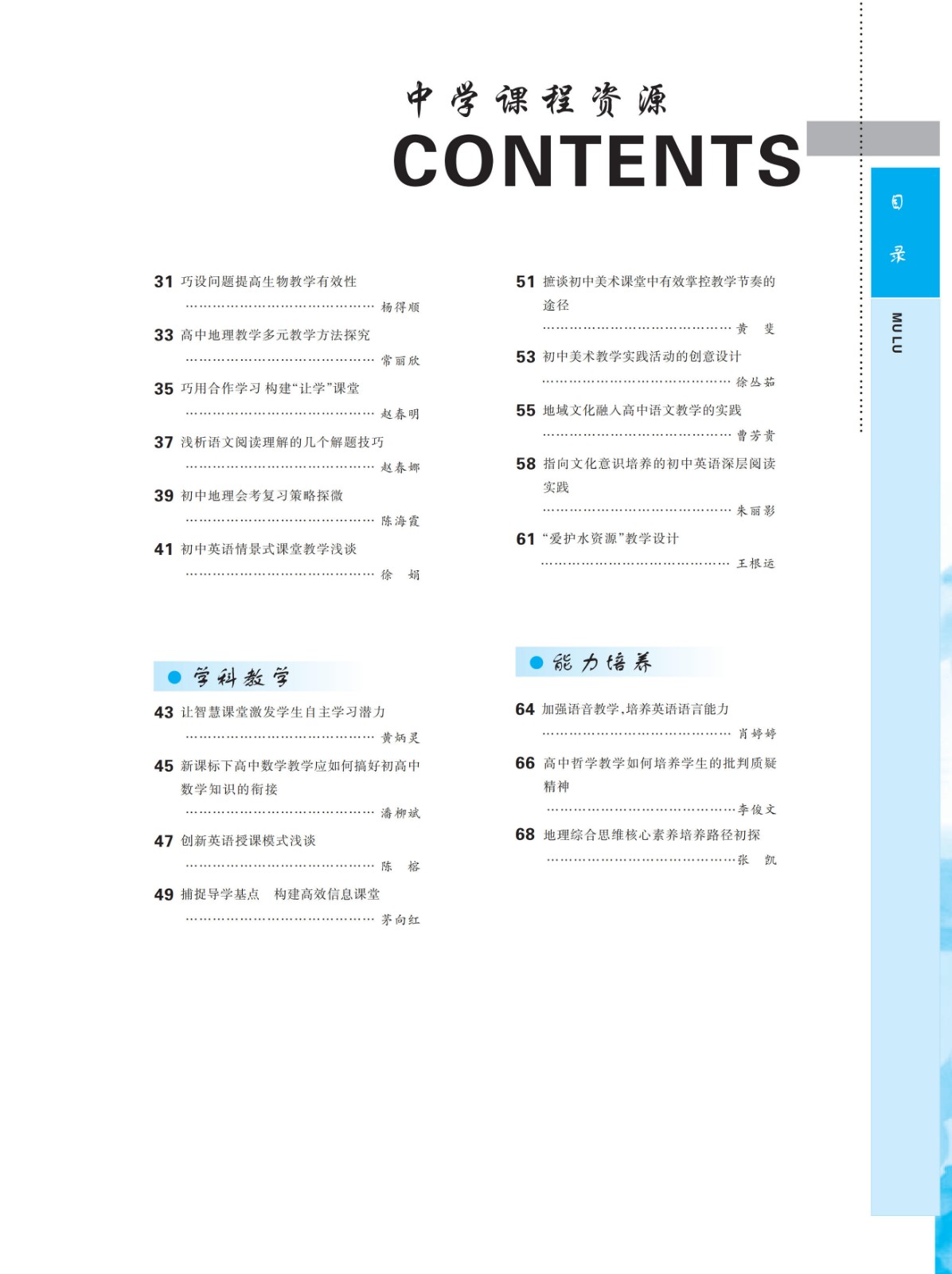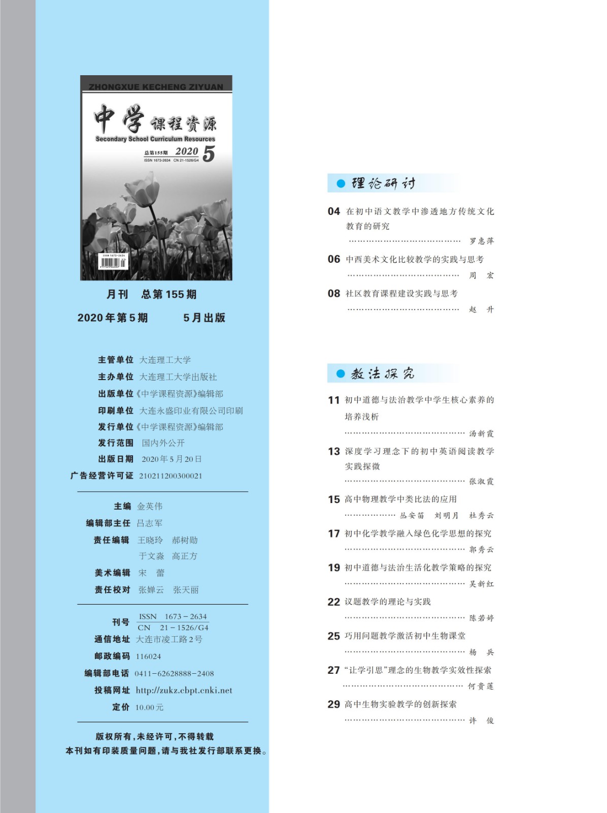《中学课程资源》由大连理工大学出版社主办,是国家新闻出版署认定的首批学术期刊。中国知网(CNKI)、万方数据库、维普资讯网全文收录期刊。本刊栏目设计精当,内容丰富,能够在思想上、政策上、业务上满足教育工作者、学生、家长的阅读需求:为助推中学课程改革、提高教师素质提供优质服务;为各学科教师分享教学经验以及交流教育成果提供广阔的资源平台;为有不同需求的学生提供学习助力,拓展视野,开阔思路;为家长在新课程实施过程中转变教育观念,与学校共同教育培养学生提供及时、可靠的信息。
