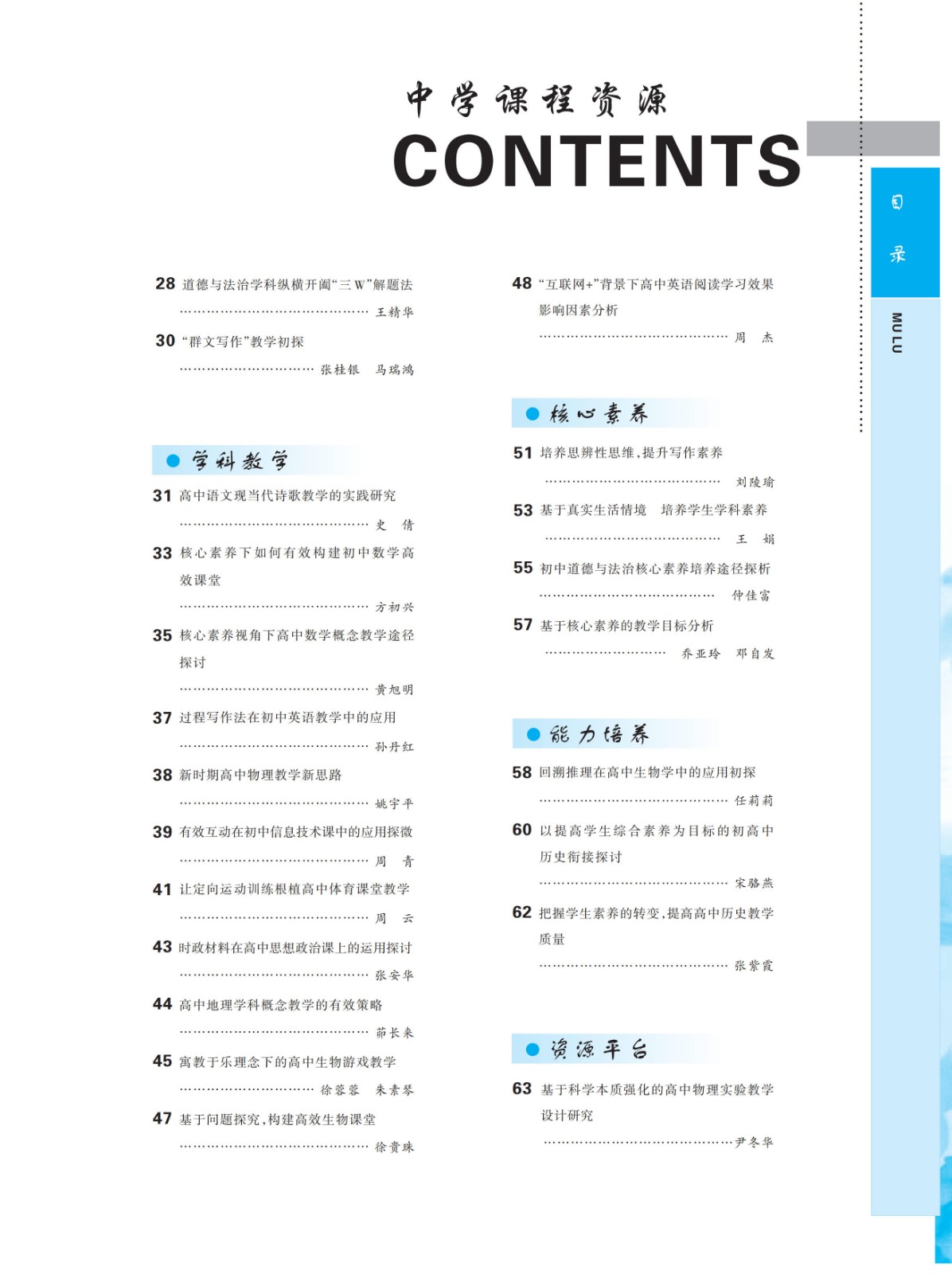 本刊主要登载教育教学改革研究的新成果、新方法,力求创新性、前瞻性、实践性,涉及初高中道德与法治(思想政治)、语文、数学、英语、物理、化学、生物学、历史、地理、信息科技、综合实践活动、体育与健康、艺术、劳动等学科,课程资源丰富、广泛。