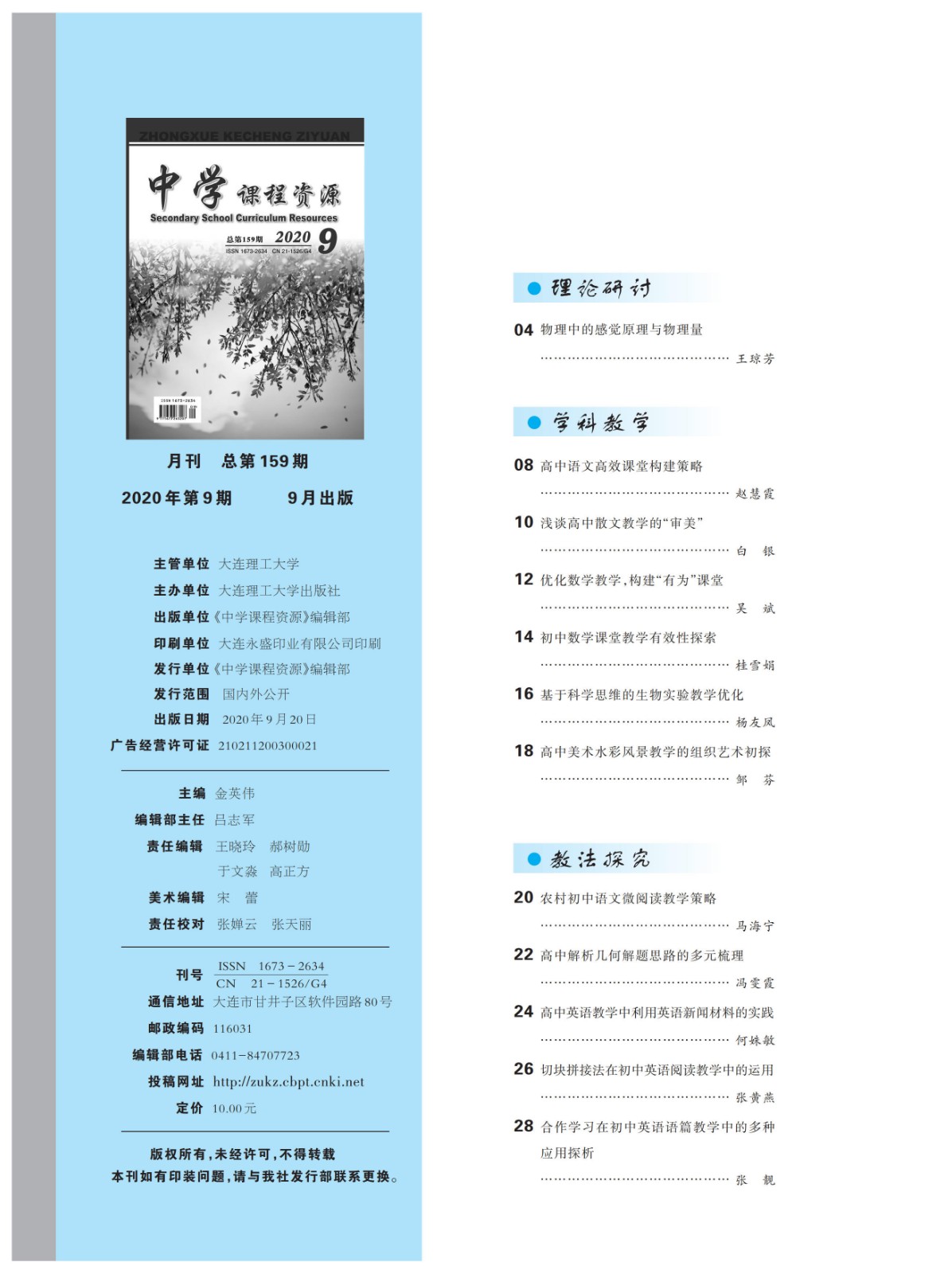 《中学课程资源》由大连理工大学出版社主办,是国家新闻出版署认定的首批学术期刊。中国知网(CNKI)、万方数据库、维普资讯网全文收录期刊。本刊栏目设计精当,内容丰富,能够在思想上、政策上、业务上满足教育工作者、学生、家长的阅读需求:为助推中学课程改革、提高教师素质提供优质服务;为各学科教师分享教学经验以及交流教育成果提供广阔的资源平台;为有不同需求的学生提供学习助力,拓展视野,开阔思路;为家长在新课程实施过程中转变教育观念,与学校共同教育培养学生提供及时、可靠的信息。
