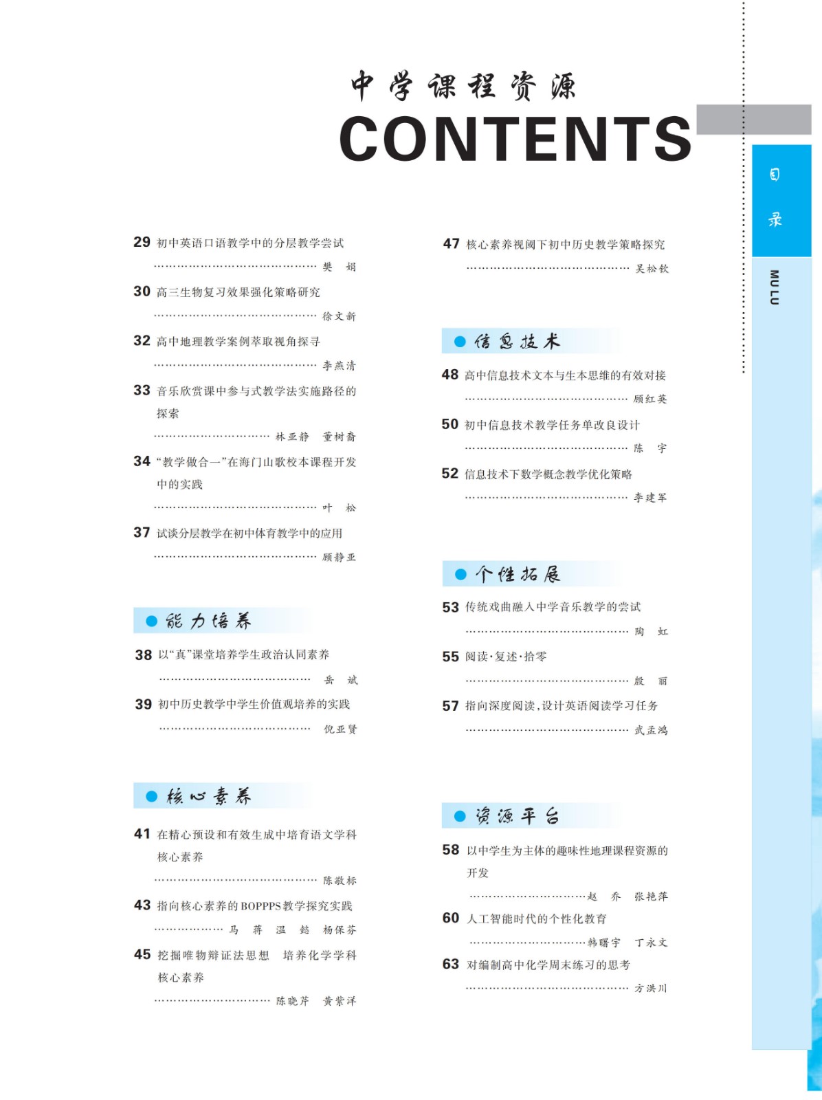 本刊主要登载教育教学改革研究的新成果、新方法,力求创新性、前瞻性、实践性,涉及初高中道德与法治(思想政治)、语文、数学、英语、物理、化学、生物学、历史、地理、信息科技、综合实践活动、体育与健康、艺术、劳动等学科,课程资源丰富、广泛。