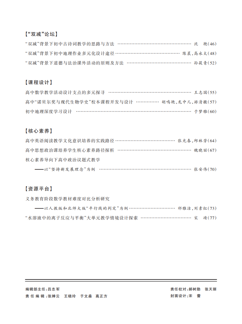 本刊主要登载教育教学改革研究的新成果、新方法,力求创新性、前瞻性、实践性,涉及初高中道德与法治(思想政治)、语文、数学、英语、物理、化学、生物学、历史、地理、信息科技、综合实践活动、体育与健康、艺术、劳动等学科,课程资源丰富、广泛。