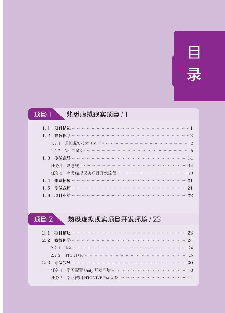 教程从实战的角度出发,总共设计了1个大的学习项目、1个随堂实训项目和1个实战训练项目。总体的设计思路是做中学和学中做,在跟着教程完成教学项目的同时,从搭建项目开始,随堂也完成一个实训项目,最后课程设计再完成一个实战项目,通过完成三个项目来学习虚拟现实项目开发。
